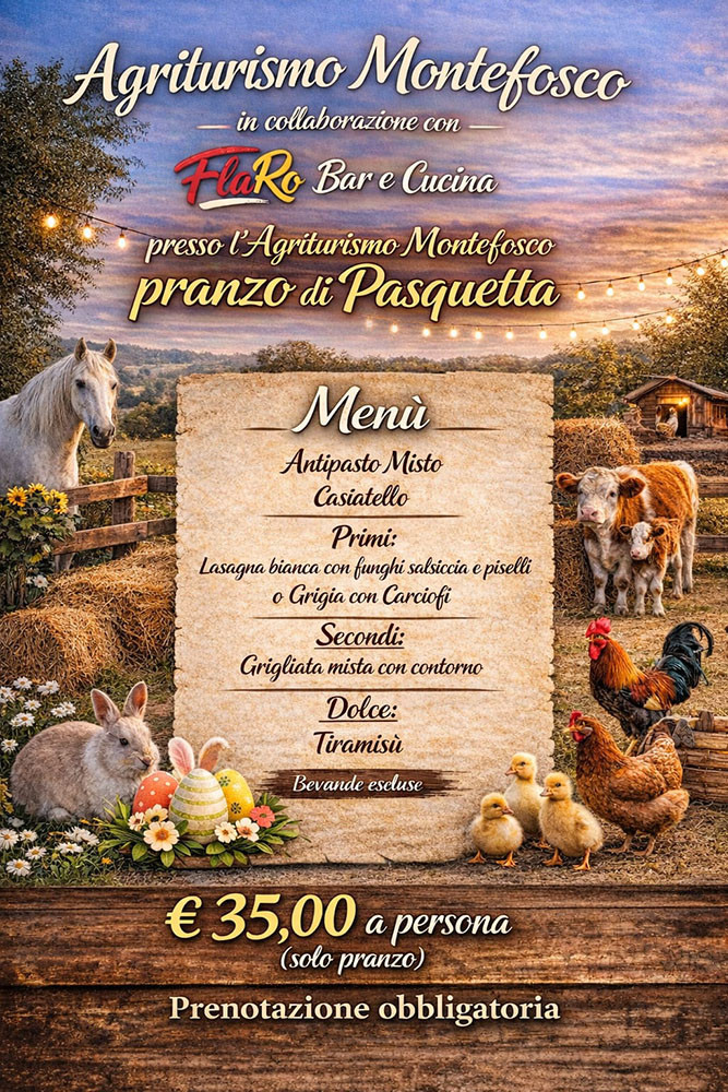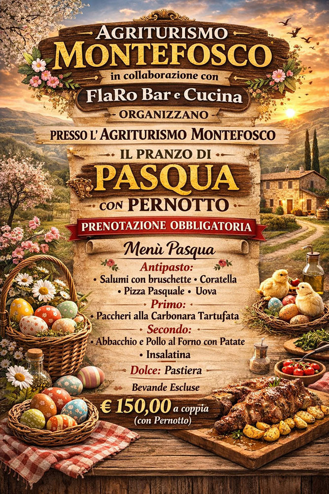 Agriturismo Montefosco in collaborazione con FlaRo Bar e Cucina organizzano presso l'Agriturismo Montefosco il pranzo di Pasqua con pernotto.